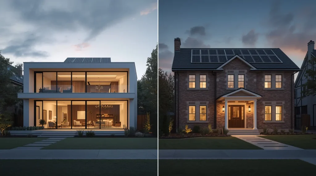 - Traditional homes: Often have more walls, pitched roofs, and classic materials like brick or stone.